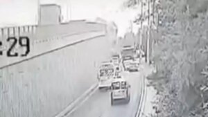 Bornova’da TIR’ın devrilip viyadükte asılı kalması güvenlik kamerasınca kaydedildi.
